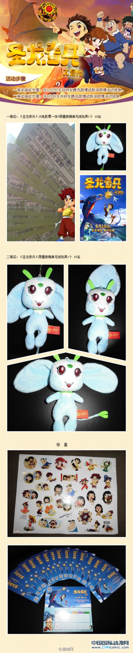 由深圳伍壹捌动漫精心打造的优质动画电影 《圣龙奇兵大冒险》 近日揭开神秘面纱,互动起来,将有机会获得《圣龙奇兵》大电影门票一张,还有精致毛绒玩具,更多惊喜等你来拿哦~快来参加吧,详情请登录漫域网圣龙奇兵。微博活动专区 http://t.cn/zHYocjk。