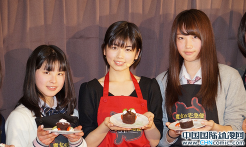 《魔女宅急便真人版》(导演清水崇)2月10日在东京某料理学校做宣传。为了迎接情人节的到来,在《魔女宅急便》中扮演女主角琪琪的小芝风花,身披大红色围裙亲自制作巧克力蛋糕。“平时不怎么做,真的很紧张,如果成功的话,我第一个想送的人就是导演清水崇。”首次挑战制作巧克力蛋糕的小芝,难掩心中对导演清水崇的感激。