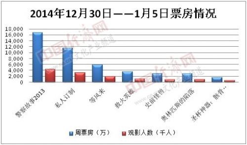 内地电影市场2014年第1周(12.30-1.05)周总票房约4.8亿,观影人次1377万。《警察故事2013》以1.6亿蝉联冠军,累计约4.4亿;《私人订制》再入1.1亿位列第二,累计近6.5亿,即将打破冯小刚《唐山大地震》6.65亿的最高票房纪录;《等风来》6天以5718万位列第三;本周有5部新片入榜,前两位占据周票房近六成。
