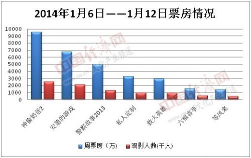 内地电影市场2014年第2周(1.6-1.12)周总票房约为3.2亿元,观影人次928万。《神偷奶爸2》上映3天以9505万元获得周票房冠军;美国电影《安德的游戏》上映6天斩获6744万票房排行老二;第三第四名则是《新警察故事2013》与《私人订制》,分别上映20天和25天,累计票房各4.9亿元与6.8亿元。