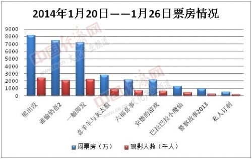 内地电影市场2014年第4周(1.20-1.26)周总票房约为3.2亿元,观影人次980万。国产电影《熊出没》斩获8177万票房,累计票房1.8亿元,一周狂甩第四名《喜羊羊与灰太狼》5420万票房。《神偷奶爸2》跌到第二位一周进账7439万票房。而光线传媒的《巴拉巴拉小魔仙》上映4天斩获1252万元票房排行本周老七。本周动画片抢占电影荧屏占票房大头。
