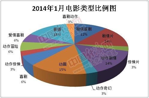 据中国经济网记者统计,一月份上映的33部影片中,爱情片、动画片所占的份额最高,其次是动作剧情片以及剧情喜剧片。从影片的类型来看,类型还不够丰富,口味不够多。类型片是中国电影市场细分的产物,它的成功标志着中国电影市场更加成熟。如《等风来》,传统的学院派中国电影人对这类片子一般是不屑一顾的。但是对于中国的电影产业来说,这种有一定票房价值的类型电影,才恰恰是最重要的基础。