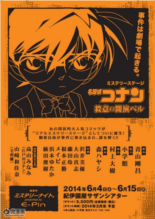 由青山刚昌所著,日本人气漫画系列《名侦探柯南》,预计将于6月在日本推出观众可一同参与解谜的互动型舞台剧“杀机的开演铃”。为纪念《名侦探柯南》20周年,官方与举办过多项解谜活动的E-pin企划合作,推出了能让台下观众与舞台演员一同解谜、抓出真凶的互动型舞台剧。这次还特别邀请到江户川柯南及毛利兰声优高山南跟山崎和佳奈一同参与演出。《名侦探柯南》解谜舞台剧“杀机的开演铃”,预计将于 6 月 4 日起至 6 月 15 日止在日本“纪伊国屋”举行。