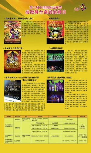据介绍,为使杭州的市民和小朋友欣赏到更多更精彩的节目内容,中国国际动漫节节展办公室与杭州盼达文化创意有限公司、浙江话剧艺术剧院、南京合谷科技信息技术有限公司等演出机构精心准备,精心策划。动漫节期间,将在杭州剧院、红星剧场、浙话剧院等地开展多点多地的展演活动,而展演在内容选择上打破了年龄的界限,既有小朋友喜欢的,也有成年人喜欢的,努力将动漫剧场打造成为跨越年龄界限的平台。